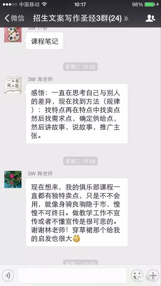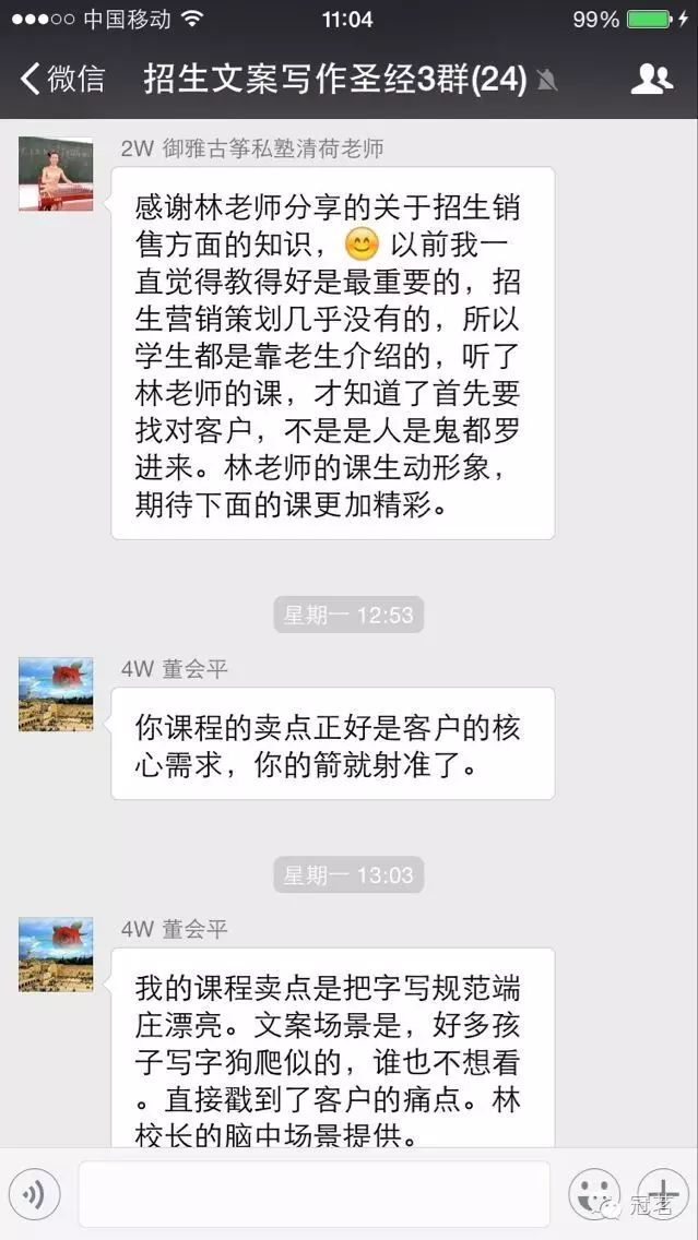 而且,更神奇的是,在这次课程中,有一个校长还没完全学完,半生不熟的写了一封招生文案,发到一个微信群,竟然招到16个来参加试听的,确定报名14人。