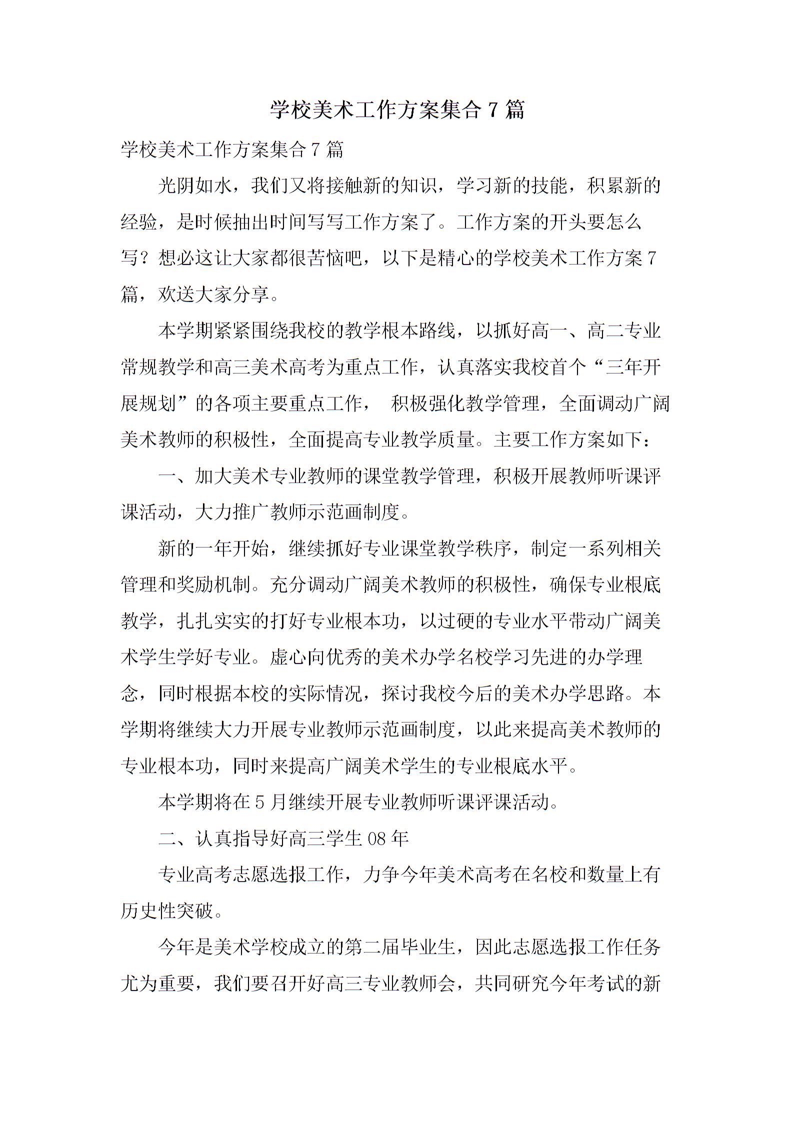 学校美术工作方案气瓶 现场处置方案 .pdf气瓶 现场处置方案 .doc见习基地管理方案.doc关于群访事件的化解方案建筑工地扬尘治理专项方案下载集合7篇学校美术工作方案集合7篇光阴如水,我们又将接触新的知识,学习新的技能,积累新的经验,是时候抽出时间写写工作方案了。工作方案的开头要怎么写?想必这让大家都很苦恼吧,以下是精心的学校美术工作方案7篇,欢送大家分享。本学期紧紧围绕我校的教学根本路线,以抓好高一、高二专业常规教学和高三美术高考为重点工作,认真落实我校首个“三年开展规划”的各项主要重点工作,积极强化教学管理,全面调动广阔美术教师的积极性,全面提高专业教学质量。主要工作方案如下:一、加大美术专业教师的课堂教学管理,积极开展教师听课评课活动,大力推广教师示范画制度。新的一年开始,继续抓好专业课堂教学秩序,制定一系列相关管理和奖励机制。充分调动广阔美术教师的积极性,确保专业根底教学,扎扎实实的打好专业根本功,以过硬的专业水平带动广阔美术学生学好专业。虚心向优秀的美术办学名校学习先进的办学理念,同时根据本校的实际情况,探讨我校今后的美术办学思路。本学期将继续大力开展专业教师示范画制度,以此来提高美术教师的专业根本功,同时来提高广阔美术学生的专业根底水平。