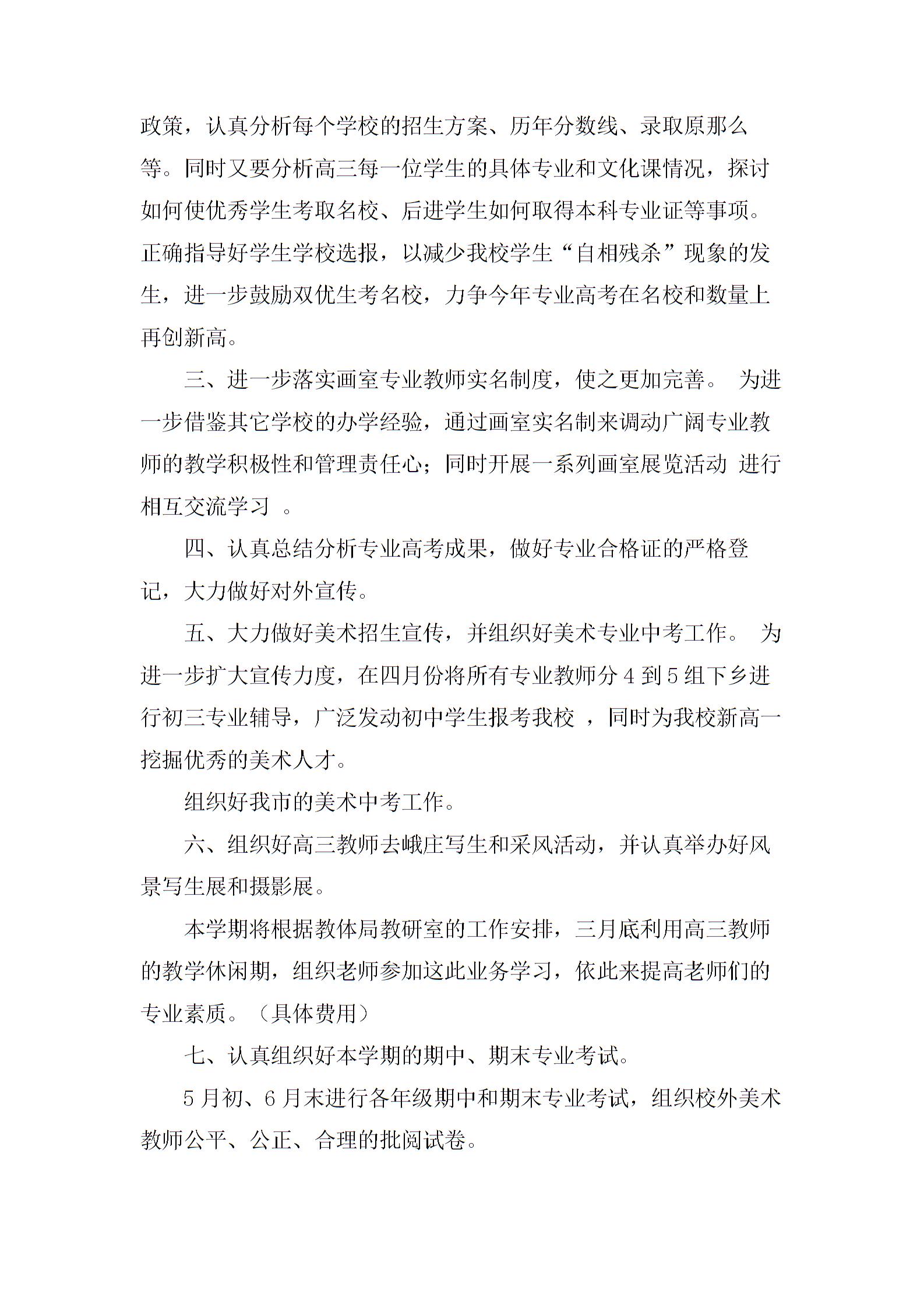 本学期将在5月继续开展专业教师听课评课活动。二、认真指导好高三学生08年专业高考志愿选报工作,力争今年美术高考在名校和数量上有历史性突破。今年是美术学校成立的第二届毕业生,因此志愿选报工作任务尤为重要,我们要召开好高三专业教师会,共同研究今年考试的新政策,认真分析每个学校的招生方案、历年分数线、录取原那么等。同时又要分析高三每一位学生的具体专业和文化课情况,探讨如何使优秀学生考取名校、后进学生如何取得本科专业证等事项。正确指导好学生学校选报,以减少我校学生“自相残杀”现象的发生,进一步鼓励双优生考名校,力争今年专业高考在名校和数量上再创新高。三、进一步落实画室专业教师实名制度,使之更加完善。为进一步借鉴其它学校的办学经验,通过画室实名制来调动广阔专业教师的教学积极性和管理责任心;同时开展一系列画室展览活动进行相互交流学习。四、认真总结分析专业高考成果,做好专业合格证的严格登记,大力做好对外宣传。五、大力做好美术招生宣传,并组织好美术专业中考工作。为进一步扩大宣传力度,在四月份将所有专业教师分4到5组下乡进行初三专业辅导,广泛发动初中学生报考我校,同时为我校新高一挖掘优秀的美术人才。组织好我市的美术中考工作。