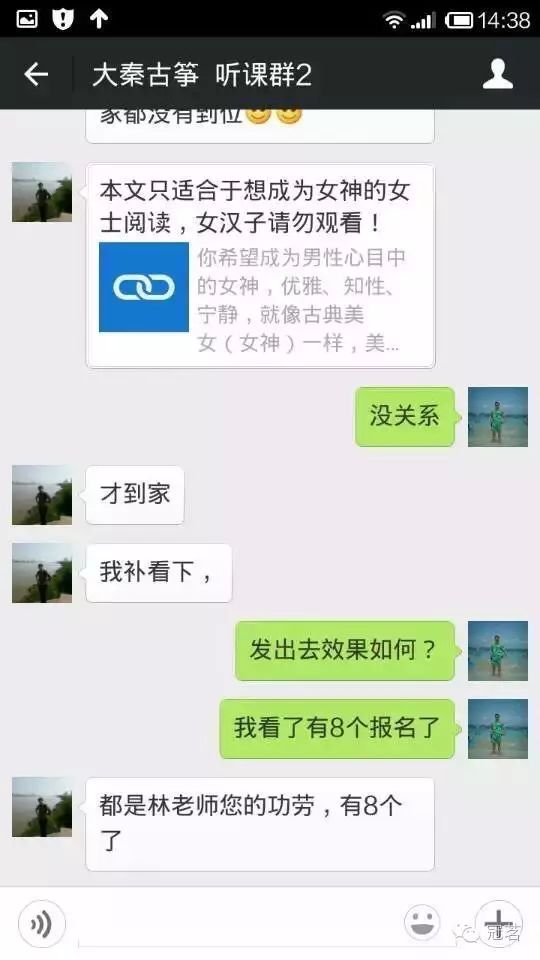 罗老师,贵州古筝培训校长,仅仅通过我的简单的指点,写出一封招生文案,招收成人古筝学生,头天晚上九点发到朋友圈里,第二天下午1点30分,不到20个小时,跟我报喜,说是已经招到8个学生了!